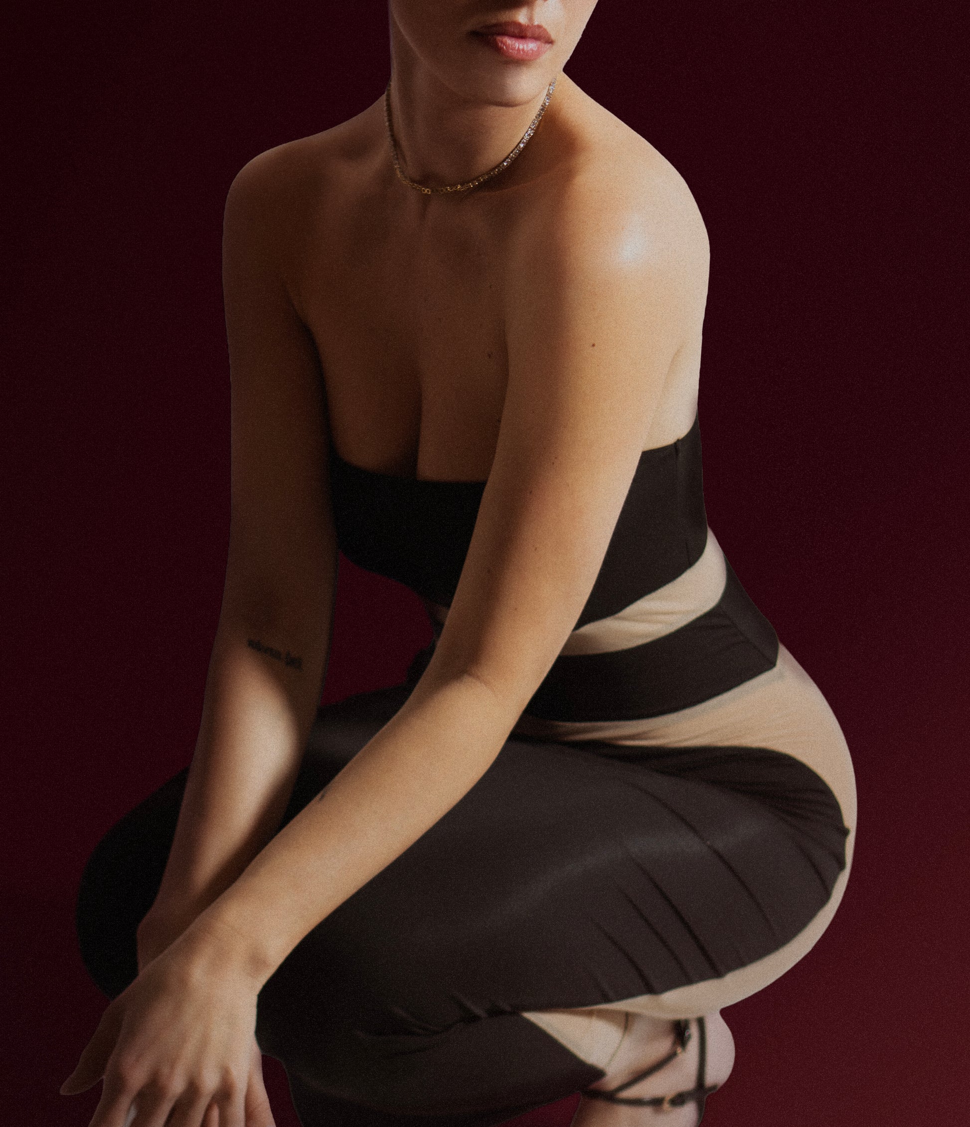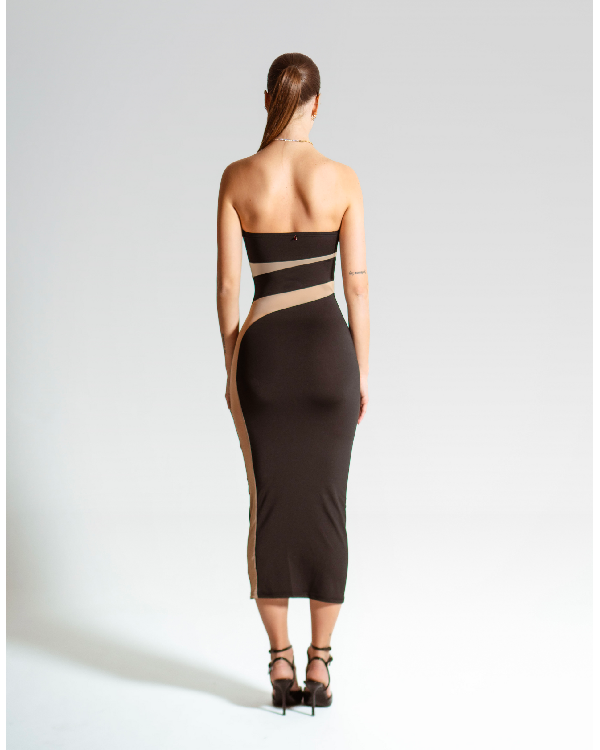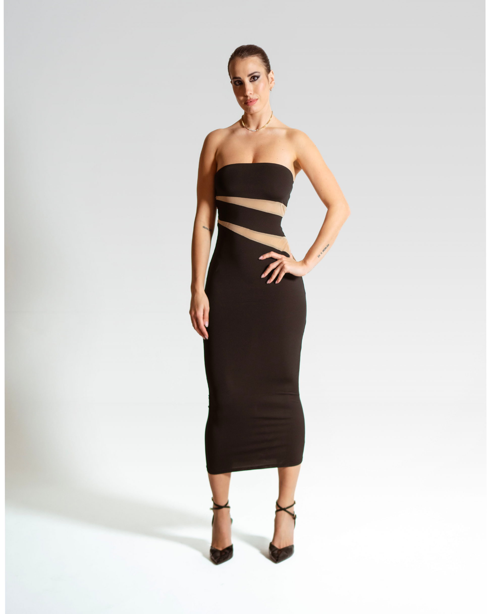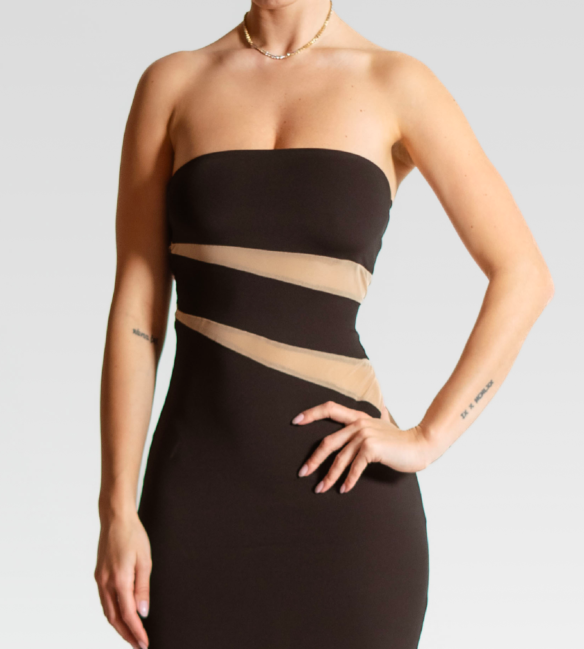 Il design senza spalline, pulito e minimal, dona un look elegante e femminile, valorizzando collo e spalle. Il dettaglio più iconico? Le trasparenze geometriche nude, posizionate in modo strategico per creare un affascinante gioco di linee che slancia la figura e aggiunge un tocco di sensualità moderna senza mai risultare eccessivo.
