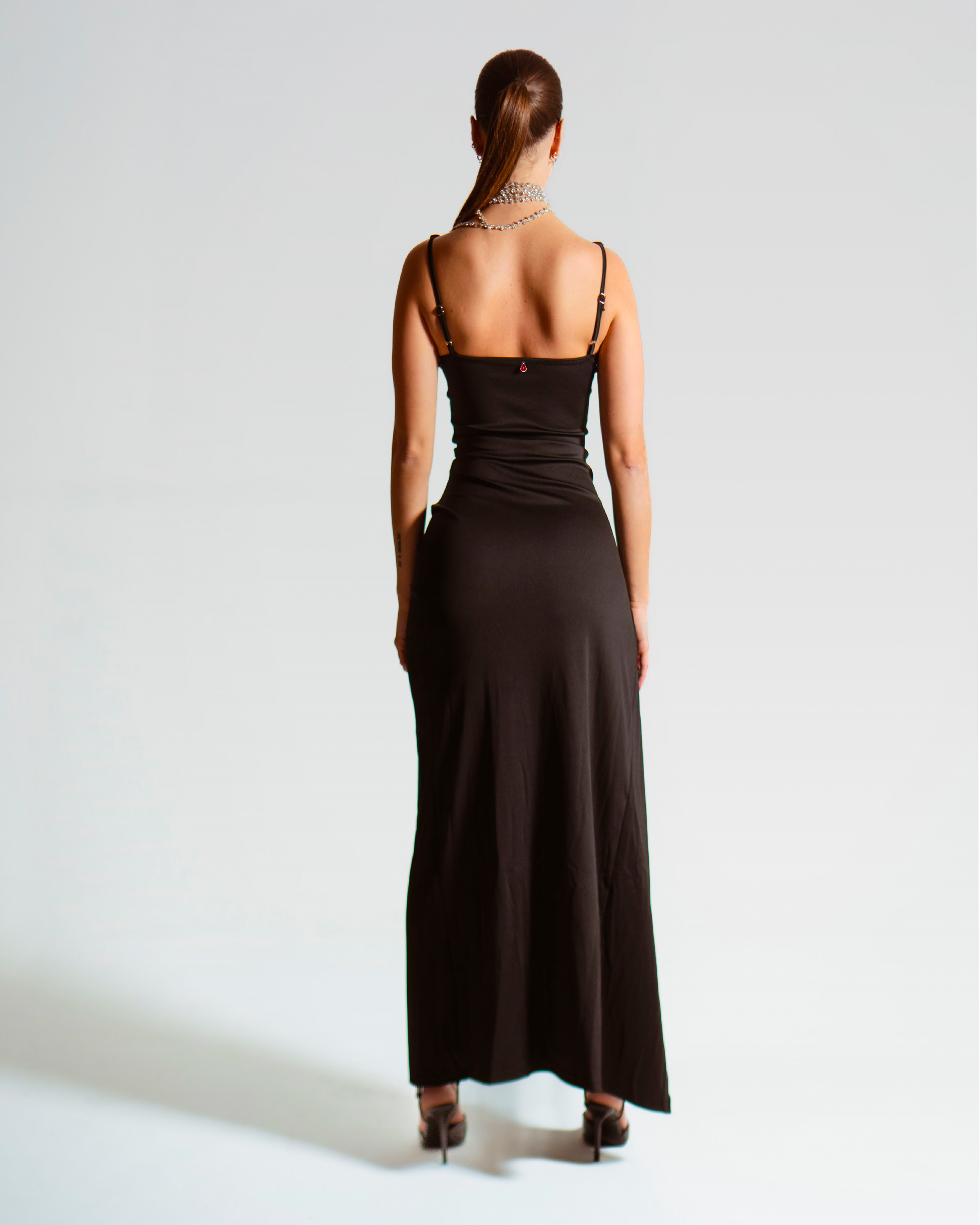 Scopri l'abito perfetto per lasciare il segno in ogni occasione speciale. Questo splendido abito lungo nero è realizzato in un tessuto satinato liscio e luminoso che avvolge la silhouette con eleganza, valorizzando le forme in modo naturale e raffinato.